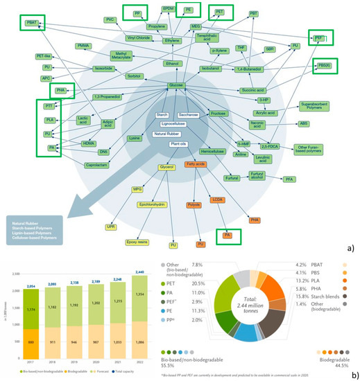 Commercially realized pathways from biomass via different building blocks and monomers to bio-based polymers (a); estimated global production capacities of bioplastics (biodegradable, bio-based/non-biodegradable) for 2022 by material type (b) [131].