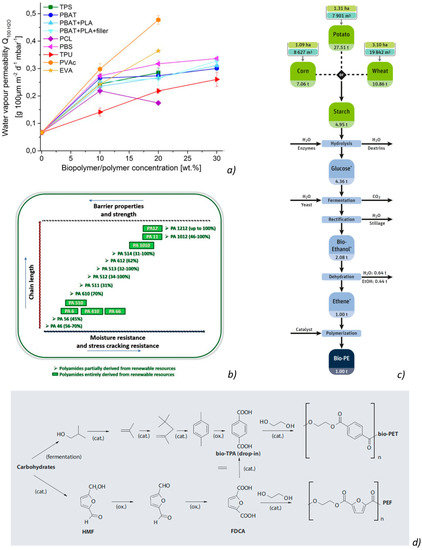 Water vapor permeability for Poly(3-hydroxybutyric acid-co-3-hydroxyvaleric acid) (PHBV) blended with nine different biopolymers and polymers at different concentrations (a) [168]; polyamides completely and partially obtained from renewable sources (b) [163]; processing route for bio-polyethylene (bio-PE) (c) [169]; (d) transformation of sugar to Polyethylene 2,5-furandicarboxylate (PEF) and bio- polyethylene terephthalate (bio-PET), a new bio-based plastic similar to PET [170].