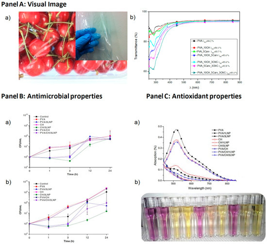 Kongkaoroptham and co-authors [37] proposed the variation of chitosan (CS) poly(ethylene glycol) methyl ether methacrylate (PEGMA) (Figure 1, Panel B, (b)), prepared by radiation-induced graft copolymerization, as a new compatible bio-based filler at the nanoscale level. The nanoparticle dimensions of PEGMA-graft-CSNPs were distributed from 30 to 100 nm. The strategy was studied to improve the compatibility, the mechanical, and the thermal characteristics of poly(lactic acid) (PLA). The mechanical properties of the PEGMA-graft-CSNP/PLA blends showed an improvement in terms of deformation at break, and a reduction of the tensile modulus brittle behavior to a more ductile behavior. In the case of poly(butylene adipate-co-terephthalate) (PBAT) films, antimicrobial packaging systems, combining different quantities of chitosan nanofibers (CS-NF), have been obtained by applying the solvent casting procedure; the biocomposites had high stiffness, strength, and glass transition temperatures, and low ductility, water vapor, and oxygen permeability. For all the nanocomposites, the migrated quantities in polar and non-polar food simulants were significantly under the overall limits recognized by the present legislation on food contact products. The produced films showed antimicrobial effect towards foodborne pathogens [81].