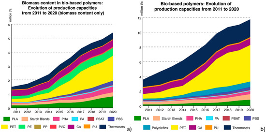 Nevertheless, the general principle to be considered to classify biodegradable materials is the raw material origin and their production step. In accordance to this, biodegradable polymers are categorized into three groups: “1st class” or biomass derived polymers, including cellulose acetate, cellulose, chitin, and starch; “2nd class” or biopolymers synthesized utilizing microorganisms and plants, as poly(hydroxy alkanoates (PHAs); and “3rd class” or synthetic polymeric matrices, as polylactide (PLA), poly(butylene succinate) (PBS), bio-polyolefins, bio-poly(ethylene terephtalic acid) (bio-PET), and synthetic polymeric matrices chemically produced from renewable sources [130] (Figure 4a,b).