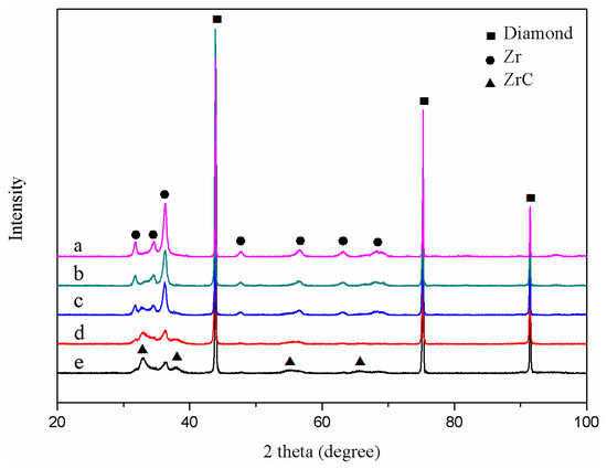 XRD of ZrC/Zr-coated diamond with different heat treatment time: (a) 0 min; (b) 5 min; (c) 10 min; (d) 20 min and (e) 30 min.