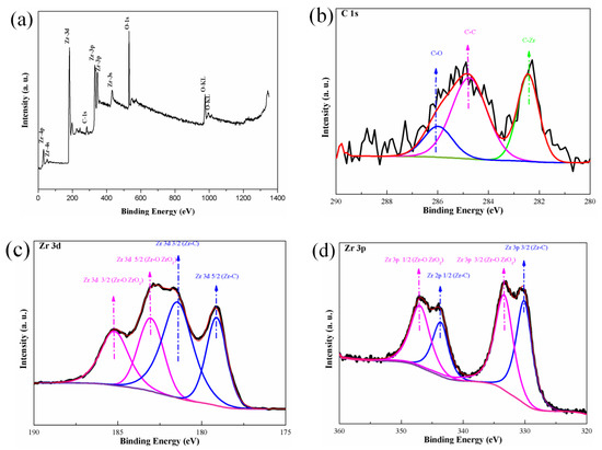 XPS patterns of ZrC/Zr-coated diamond particles: (a) full-scanning spectra; (b) narrow-scanning spectra of C1s; (c) narrow-scanning spectra of Zr3d; and (d) narrow-scanning spectra of Zr3p.