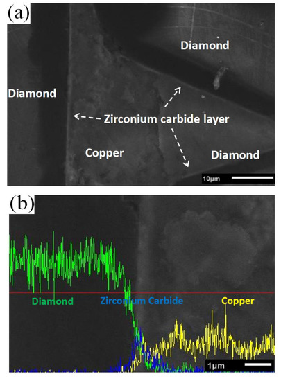 A low solubility of zirconium in copper matrix can ensure the TC of the copper matrix. On the basis of the sintering characteristic of SPS, the rapid shaping process effectively holds the original form of the diamond coating layer. Irrespective of the small amount of zirconium on the diamond surface diffusing into the copper matrix, the ZrC/Zr layer was homogeneous at the interface, as shown in Figure 5a. Three separate zones existed among the interface; namely, the matrix, the interface layer, and the reinforcement particles. The sintering temperature was not high, and the sintering time was limited. The outer zirconium layer did not completely diffuse into the matrix. The zirconium layer near the copper became ambiguous, as shown in Figure 5b. EDS interface line-scanning was adopted to analyze the elemental distribution at the interface. A sharp increase in intensity of zirconium was obtained with the elemental line scan from the copper matrix to the diamond particle, indicating that the ZrC/Zr layer exhibited relatively strong bonding at the interface.