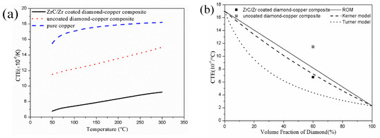 The match of CTE between substrate plate and microelectronic devices is also crucial for electronic packaging. The measured values of the composites with increasing temperature are shown in Figure 7a. The ROM, Turner, and Kerner models are three original models for predicting composite CTE [10,12,14].