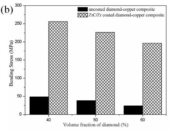 The mechanical properties of diamond-copper composites can also reflect the interfacial bonding between diamond particles and the copper matrix. Figure 8a shows the bending stress-deflection curves of diamond-copper composites. With the improvement of interfacial combination by the ZrC/Zr layer, bonding strength was augmented significantly. The inner ZrC layer formed strong chemical bonding with diamond particles after heat treatment. The outer Zr layer partly diffused into the copper matrix, then enhanced metallurgical bonding. With the well-designed interface structure, the ZrC/Zr layer limited the shear deformation between diamond and copper under shear load. The bending strength of 40 vol. % ZrC/Zr-coated diamond/Cu composite reached 255.95 MPa. Contrarily, the bending stress of uncoated diamond/Cu composite with the same volume fraction reached only 48.62 MPa (Figure 8b).