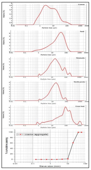 The concrete mixes were manufactured in the proportion of 1:2.08:3.57 corresponding for Binder: Fine aggregate: Coarse aggregate, as per BIS 10262-2009 [] referring to guidelines for concrete design mix proportioning with constant water binder ratio 0.4 to yield M40 grade of concrete mixes. Four additional concrete mixes were produced by proportioning marble powder and green sand as various percentages are shown in Table 2. The particle size of the materials observed through sieve analysis is shown in Figure 1.