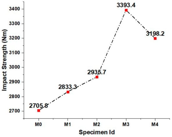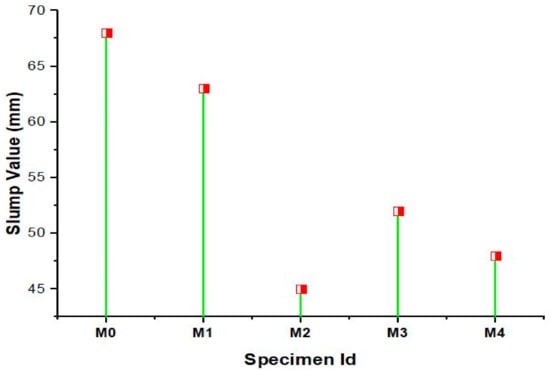 The fresh state properties of the concrete mixes were determined using slump test conforming to IS1199-1959 and the hardened state properties were analyzed by conducting compressive strength on 150 mm concrete cube specimens, flexural strength test on 100 mm × 100 mm × 500 mm prism specimens and split tensile strength test on 150 mm diameter × 300 mm height cylindrical specimens at several ages conforming to BIS516-1959 []. Impact test (drop weight method) on 150 mm diameter and 63.5 mm height cylindrical disc specimens conforming to ACI 544 following that the specimen is place in the base plate above which a steel ball of 63.5 mm diameter is setup and loaded by dropping a hammer of weight 4.54 kg from 457 mm vertical height and static energy calculated as product of dropped mass, height of drop, number of blows at failure and acceleration due gravity. Finally the water absorption and porosity of the concrete specimens were determined according to ASTM C642-06 [] on cubic specimens of 100 mm size that are to be normally water cured and then oven dried at 110 °C for 24 h. Water absorption is calculated with weight of specimens before and after drying. 100 mm cube Specimens are placed in boiled water for 5 h and allowed for natural loss of heat, followed with surface dry with cloth and the porosity is calculated in percentage of ratio of difference between surface dried mass and specimen mass before immersion to the difference between surface dried mass and submerged weight of the specimen. X-Ray Diffraction (XRD) analysis was done to investigate the crystallinity of the formed hydration products. The X-ray patterns of the powdered concrete mixes were recorded using Xpert Pro Panalytical diffractometer (Xpert Pro Panalytical diffractometer, supplied by PANalytical India, Haryana, India) and the obtained patterns were compared to the XRD patterns of JCPDS (Joint Committee on Powder Diffraction Studies) to analyze the mineralogical composition. The XRD patterns were recorded at 2-theta angles ranging from 10° to 90° at a step size of 0.02. The Scanning Electron Microscope (Zeiss, Shimadzu, Japan) operating at an accelerating voltage of 20 kV with secondary electron (SE) mode was used to obtain the micrographs of the concrete mixes. The SEM examination was done on small fragments of size 5mm obtained from the concrete specimens after 28 days of curing.