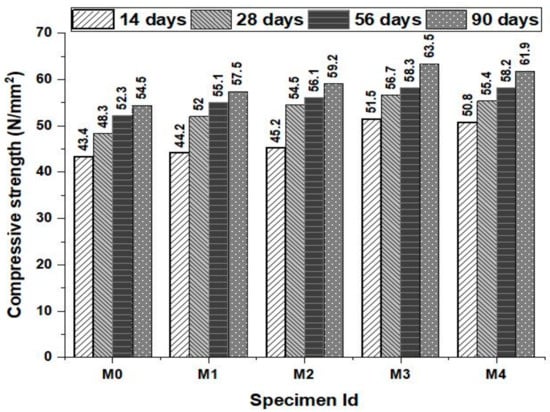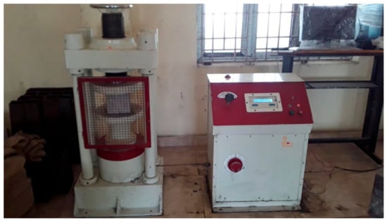 Figure 4 shows the test setup (Scientific, 300 ton capacity, supplied by Shiv Ganga Industries, India) and the compressive strength of the concrete mixes at the ages of 14, 28, 56 and 90 days is shown in Figure 5. It can be clearly inferred that the compressive strength of the concrete increased with increase in substitution rate of green sand and marble powder as fine aggregate in a concrete. The improvement in the compressive strength of the concrete is due to the presence of more silica content that enhanced the formation of hydration products in the concrete. The compressive strength of the concrete specimens is also influenced by the percentage of metakaolin and it can be observed that the addition of metakaolin improved the compressive strength when used as a partial substitute for cement and this can be attributed to the property of metakaolin such as the filler effect, pozzolanic reaction of metakaolin with calcium hydrate and the compounding effect of metakaolin. The very early strength is also due to accelerated hydration forming aluminum ions during dehydroxylation. In the presence of water, Calcium hydrates and crystalline products of aluminate hydrate and alumina-silica hydrates promoting pozzolanic activation depending on kaolin to hydrates. Metakaolin was set to use 5% throughout for all mixes that lies within the remarkable limits from the earlier studies. Metakaolin substitution reduces the continuity of pores that make the matrix less permeable. The increase in strength was observed that the mixes performed well at the early strength and this may due to the contribution of metakaolin to produce the paste with less pores. The results observed at 90days also showed that the mix with 15% of green sand and marble powder performed well than all other mixes. The marble powder substitution also contributed to the strength of the concrete by their filler effect that densify the paste structure of the concrete by using reducing the pore volume of the concrete. It can also be seen that the compressive strength of the concrete increase up to 15% replacement of the fine aggregate beyond which slight reduction in the compressive strength of the concrete was observed. The reduction in the compressive strength beyond 15% replacement of the fine aggregate by green sand and marble powder may be probably due to the increased surface area of the fine aggregates but led to the reduction in the water cement gel in the matrix. This reduced cement gel is not sufficient to bind the fine aggregates and coarse aggregates that affect the structural integrity of the concrete accompanied by slight reduction in their compressive strengths. Moreover the interruptions on the grain size distribution caused by these powder filler materials reduce the compressive e strength of the concrete by increasing the pore spaces in the concrete. This is in agreement to the similar study conducted using green sand as fine aggregate replacement beyond 20% also showed reduced compressive strength due to the presence of more amount of silica that significantly affected the hydration process []. The compressive strength increment may also be caused due to the metakaolin substitution due to densification of the microstructure of the concrete [].