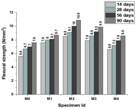 The flexural strength development of the concrete mixes at various ages of 14, 28, 56 and 90 days are shown in Figure 6 and failure of specimen under testing (Scientific, supplied by Shiv Ganga Industries, India) is shown in Figure 7. The results clearly explain the influence of green sand and marble powder in improving the flexural strength at all ages of the concrete when compared to the normal concrete. This improvement in the flexural strength of the concrete mixes may be attributed to the higher fineness and morphologically rough texture of the marble powder and green sand in comparison to river sand. The fineness of these powdered materials densified the cement matrix and the rough surface texture improved the adhesion in the concrete that actively bonded the cement and the aggregates. The declining trend in the flexural strength may be due to the fact that after the attainment of the optimum content of replacement the increased substitution of the fine aggregate by marble powder and green sand loses its effectiveness as a filler agent by increasing the specific surface area of the concrete.