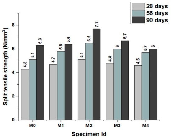 The splitting tensile strength test (Scientific, supplied by Shiv Ganga Industries, India) setup on cylinder specimen is shown in Figure 8 and that of the concrete mixes at various ages is shown in Figure 9. The improvement in the split tensile strength of the concrete follows the same trend of the flexural strength improvements. It can be observed that the splitting tensile strength of the concrete increases with the increasing percentage level of the fine aggregate by green sand and marble powder. This improvement in the splitting tensile strength may be due to the strong bonding behavior exhibited by the marble powder and green sand replacement and also due to the pozzolanic effect of metakaolin that increases the denseness and compactness of the concrete. This shows that the study of flexural and split tensile strength was about to be similar conforming that the optimum replacement levels for both fines and binder with marble, green sand and metakaolin to be limit with 10% and 5%respectively. Beyond 20% replacement of fines, the mixes performed good than control but the trend of negative linear relation with increase in replacement percentage. It is also observed that increase in strength with age is close to the conventional concrete but the early strength at 28 days was clearly understood to be due the densification of concrete by metakaolin. It is also understood that the water requirement needs to be corrected and addition of superplasticizers is strongly recommended for the mixes beyond 30% replacement. Metakaolin contributes towards the hydration of paste and early strength of concrete. Performance of mixes at the age of 90 days was observed to be right linear upto 20% replacement and thereafter the declining trend and then for the mix M4, the split tensile strength seems the same that of control concrete. This agrees well to the previously conducted studies on metakaolin as cement replacement [].