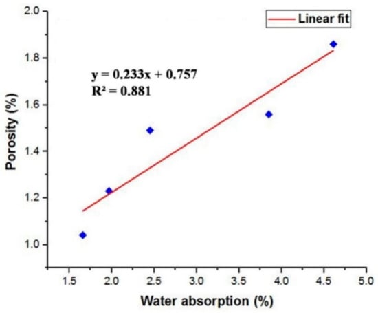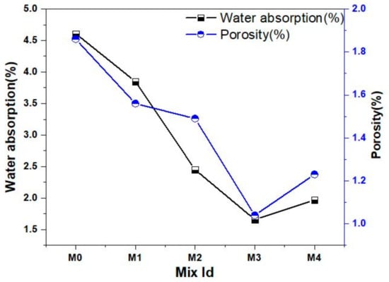 The water absorption values of the concrete mixes with and without the fine aggregate replacement are provided in Figure 12. It is observed that the water absorption of the concrete decrease with increase in the percentage of replacement in the fine aggregate by marble powder and green sand. This decreased water absorption behavior of the concrete may be explained by the reduction in the voids caused by the green sand and marble powder. The lower water absorption capacity of the concrete mixes containing marble powder and green sand can be related to the nature of the pore spaces within the hardened concrete. The water absorption of the concrete is mainly dependent on the cement paste which is the only continuous phase in the concrete. The aggregates usually contain discontinuous pores that are enveloped by the continuous phase of cement paste that causes reduction in the pore and also the water absorption of the concrete. Hence the influence of the aggregate is very small and do not contribute much to the water absorption of the concrete. Hence the quality of the cement matrix has the greatest effect on the water absorption behaviour of the fully compacted and hardened concrete. In this present study the use of metakaolin as partial replacement for cement improves the pore structure of the concrete by reducing the total pore volume of the concrete by the formation of denser hydration products during the period of curing. Figure 12 also shows the change in the porosity values of the concrete mixes using green sand and marble powder as partial substitute for fine aggregate. From Figure 12, it can be seen that the porosity of the concrete decreases with increase in the percentage of marble powder and green sand substitution. The improvement in the pore structure of the concrete could be explained as a result of the filler effect of the green sand and marble powder. Moreover the porosity of the concrete was also much influenced by the addition of metakaolin. The micro filling effect and the pozzolanic reaction of the metakaolin particle highly refined the pores by enhancing the micro and macro structures of the cement paste. The increase in the porosity values may be attributed to the non-uniform grading caused by these powdered aggregates when used with metakaolin that possesses a more specific surface area than that of cement, leading to the increased absorption of water, as evident from previous research [,].