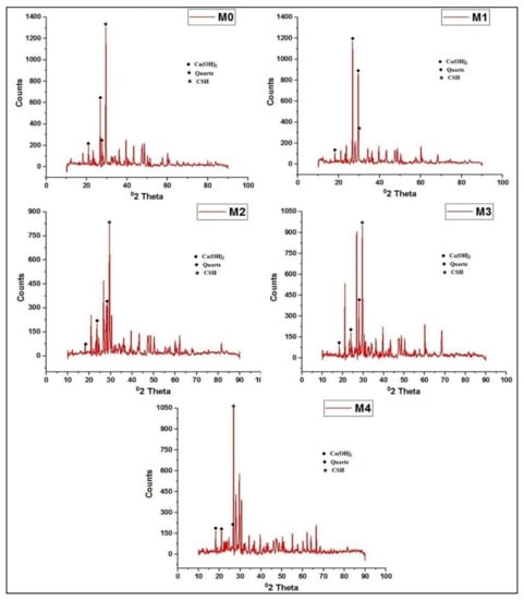 The XRD studies (Figure 13) done to analyze the components of the concrete mixes and the obtained diffraction patterns are shown in Figure 14. The main peaks that were formed were identified as quartz, portlandite Calcium Hydroxide and Calcium Silicate Hydrate gel (CH and CSH). The patterns clearly indicate the strong peak of quartz indicating the presence of free silica. The hydration product phases CH and CSH were found to vary in their intensities in the patterns exhibited by the hydrated pastes. It can be clearly seen that the peaks of portlandite were found to decrease in all the concrete mixes indicating the effect of pozzolanic action of metakaolin that effectively converted the CH to CSH. The quartz peak were also found to decrease or increase in the intensity indicating the interaction of the free silica with the CH to form CSH gel. The free silica increases the intensity of the quartz peak in the diffraction patterns with increasing marble powder and green sand due to the relatively higher amount of silica present in these powdered aggregates when compared to the river sand. The formation of high intense CSH peaks with the relatively less intense CH peaks helps in improving the pore structure of the concrete which subsequently increases the strength of the concrete.