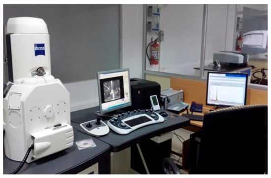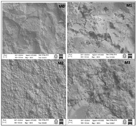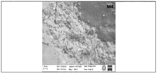 The morphology of the concrete mixes as obtained from the Scanning Electron Microscope Equipment (Figure 15) and result images is shown in Figure 16. The main strengthening phase present in the concrete is the CSH gel. The formation of CSH gel also depends on the grain size and distribution of the aggregates. The pore size distribution and composition of the continuous phases in the concrete also plays a vital role in the CSH gel formation. From the SEM images the bright phases of CSH gel formations are seen in the concrete mixes. It can be clearly seen that the CSH gel formed was spread uniformly throughout the concrete mixes that formed a layer over the aggregates that acted as binder for the cement matrix and the aggregates. The presence of dark regions in the SEM images indicates the voids or pores in the concrete which is visibly reduced in all the concrete mixes indicating the contribution of marble powder and green sand in porosity reduction. Since the strength of the concrete is inversely proportional to the number of voids, the improved strength of the concrete may be attributed to the reduction in voids of the concrete. The microstructure also shows the well distribution of the marble powder and green sand in the concrete that improved the morphology of the concrete by densifying the microstructure. Moreover the use of metakaolin as a partial substitute for cement also enhanced the hydration reaction, due to its pozzolanic behavior, which transforms the CH to CSH gel and fills the pores of the concrete, which in turn increases the compressive and flexural strength.