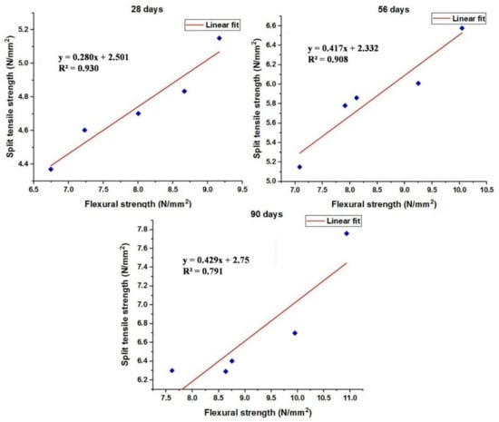 With the help of the experimental data, graphs were plotted between split tensile strength and flexural strength of concrete mixes at various ages. The linear relationship between split tensile strength and flexural strength is obtained through the predicted equation and their corresponding regression coefficient R2 values are also shown in Figure 17 and Figure 18.