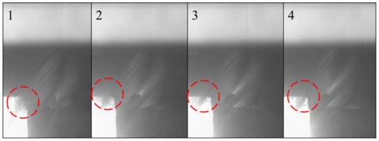 All machining experiments were conducted on a VMC XP10 Bridgeport CNC milling center equipped with a retrofittable external cryogenic cooling nozzle. The cryogenic cooling nozzle used for the experiments is shown in Figure 1. The nozzle was placed around the cutting tool covering the periphery of the tool with 1 bar of LN2 at 20 kg/h flowrate. There was a 0.5 mm clearance between the nozzle and the cutting tool’s outer diameter. The slow-motion time lapse of the LN2 delivered into the cutting zone through the flute of the tool is shown in Figure 2 with the circle highlighting the LN2. This figure clearly demonstrates that the LN2 was only delivered into the cutting zone without flooding the workpiece. Therefore, the cooling was limited to the cutting zone without significantly affecting the temperature of the workpiece. The tight (0.5 mm) clearance between the nozzle and the cutting tool ensured that LN2 can only flow through the cutting tool’s flute into the cutting zone.