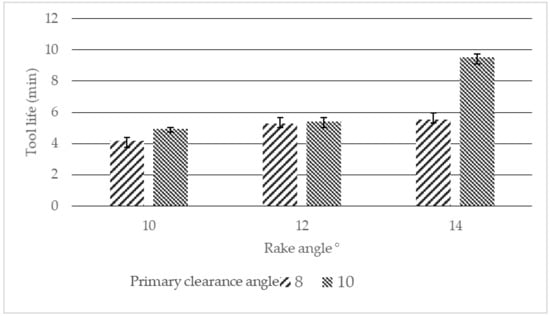A series of machining experiments were conducted by varying rake and primary clearance angles in cryogenic end milling of Ti–6Al–4V as described in Section 2. The tool life for each experiment was recorded and is presented in Figure 3. This shows that increasing the rake angle from 10° to 14° results in increased tool life. The longest tool life of 9.7 min was achieved using the tool with a 14° rake angle and 10° primary clearance angle. In all experiments, the tool with 10° primary clearance angle performed superior to their counterpart with a 8° primary clearance angle. However, the impact of primary clearance angle on tool life was minimal at lower rake angles of 10° and 12°. It is known that increasing positive rake angle can lead to reductions in cutting forces, power consumption, and cutting temperatures [47,48,49,50]. However, after reaching a certain limit, increasing the rake angle will weaken the cutting edge and results in rapid tool wear [48]. In this study, increasing the rake angle from 10° to 14° favorably resulted in increased tool life. Kaymakci et al. [51] reported that increasing clearance angle to an optimum angle results in improved tool life by minimizing flank wear. Further increasing of the clearance angle above the optimum angle, weakens the cutting edge leading to chipping and tool failure.