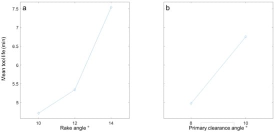 Main effect plots showing the effect of (a) rake angle and (b) primary clearance angle on tool life.