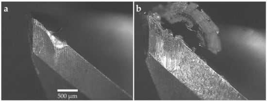 Micrographs of the tool with a 10° rake angle: (a) 10° primary clearance angle and (b) 8° primary clearance angle.