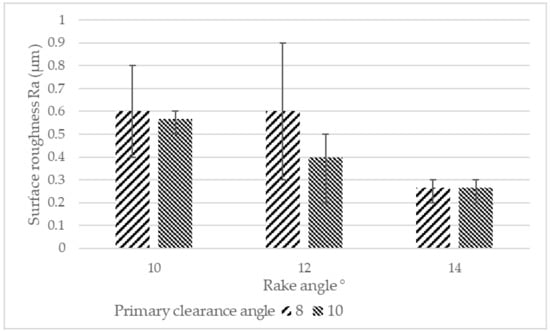 Average surface roughness Ra for tools with different rake and primary clearance angles.