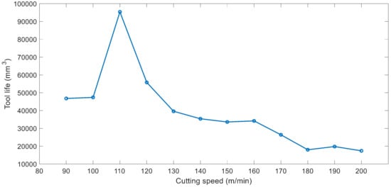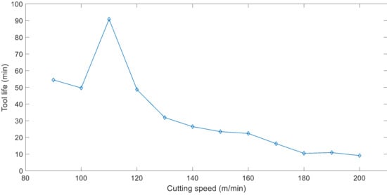 As shown in Figure 9 and Figure 10, the tool life increases sharply when increasing cutting speed from 100 m/min to 110 m/min. The tool life gradually decreases by increasing cutting speed from 110 m/min to 200 m/min. The longest tool life was recorded to be 91 min equivalent to machining 95400 mm3 of Ti–6Al–4V workpiece material achieved at 110 m/min. This constitutes that 10% increase in cutting speed from 100 m/min resulted in 83% increased tool life in minutes and 101% increased material removal.
