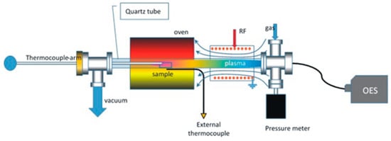 Schematic drawing of the ICP-CVD tubular reactor for producing carbon structures. The reactor is composed of a quartz tube, an oven, and a coil connected to an RF power supply. The sample is placed in the middle of the oven. The system is evacuated with a primary rotatory pump and the pressure were analyzed with a pressure meter. The temperature is measured by means of two thermocouples. Different gases can be introduced through an inlet at one end of the quartz tube. OES: Optical Emission Spectroscopy device to study the emission of plasma generated species.