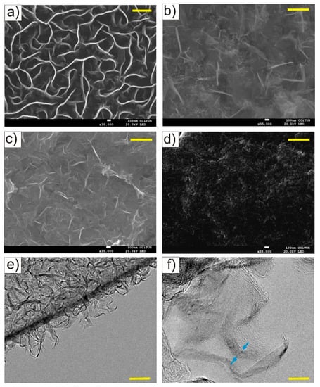 SEM images of GNWs grown on SS, (a) MnO2/GNWs without thermal treatment, (b) MnO2/GNWs with annealing at 200 °C (c) and 600 °C (d). TEM images of as grown GNWs (e), (f). Arrows indicate thickness of the nano-walls. Scale bars correspond to 500 nm in (a–d). 100 nm in (e) and 10 nm in (f).