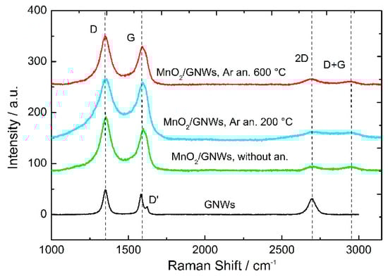 Raman spectra of bare GNWs show typical D and G bands at 1346 cm−1 and 1587 cm−1 (Figure 3). The large number of defects (high D-peak) is associated with the plasma deposition technique. A shoulder appears next to the G band at 1616 cm−1 (D’ band) related to the finite size of graphite crystals and graphene edges []. Furthermore, the presence of a peak at 2700 cm−1 (2D) and I2D/IG = 0.8 confirms the presence of few-layered graphene in accordance with TEM images (Figure 2e,f). An additional peak appears at 2940 cm−1 related to sp2 CH stretching vibrations []. MnO2/GNWs samples without and with annealing at different temperatures show similar Raman spectra, which indicate little or no alteration of the graphene nano-walls structure after MnO2 deposition and thermal treatment (Figure 3). Main D and G bands are clearly recognized for all the samples without big differences between them. However, unlike the bare GNWs sample, the D’ shoulder is not appreciable for these samples. In addition, 2D and D + G bands appear much weaker than for bare GNWs sample due to the presence of MnO2 coating on the surface and edges of the nano-walls. No specific bands of MnO2 are recorded, likely due to its low loading, low crystallinity, and/or small crystal size [].