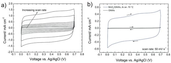 (a) Cyclic voltammograms of MnO2/GNWs sample annealed at 70 °C using scan rates 10, 20, 30, 40, 50, 100, and 150 mV·s−1. (b) Bare GNWs and MnO2/GNWs sample annealed at 70 °C using a scan rate of 50 mV·s−1 and a voltage window between 0.0 to 0.7 V vs. Ag/AgCl. Arrows indicate the direction of the scan.