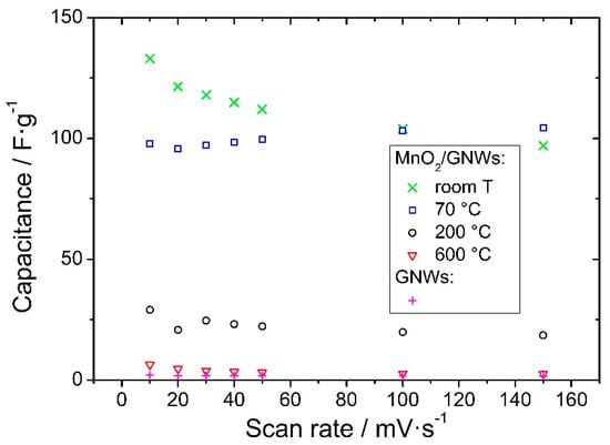 The heat-treated samples are expected to show lower open porosity and lower surface area, especially those heated at high temperatures above 200 °C. In addition, it has been suggested that high scan rates limits proton and Na+ ion diffusion and makes some pores and voids inaccessible [], which implies a decrease in SC with a scan rate. It is also known that a heat treatment below 220 °C removes water and trace amounts of oxygen [], and, around 500 °C, a transition occurs from α-MnO2 to crystalline Mn2O3 by loss of oxygen (chemical transformation) [,,], which explains the low SC of the samples treated above 200 °C. However, the sample annealed at 70 °C shows a particular behavior increasing its SC with the scan rate (Figure 5 and inset graph in Figure 6). This phenomenon has already been reported previously and has been assigned to an excellent contact between the porous collector (GNWs in this case) and the oxide that allows efficient access of both electrons and ions to afford a fast redox reaction at high scan rates []. This redox process takes place at the surface of MnO2 where only a thin layer of MnO2 is involved and is electrochemically active [].