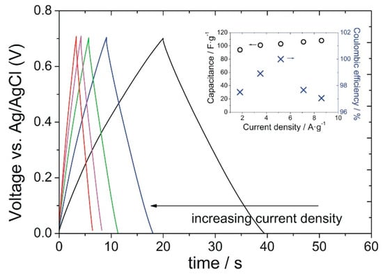 The CV analysis was performed using a voltage window of 0.0 to 0.7 V vs. Ag/AgCl at scan rates between 10 and 150 mV·s−1. An alternating voltage of 10 mV amplitude was applied to the samples between 1 Hz and 100 kHz for the EIS analysis. Lastly, several thousands of charge/discharge cycles were applied to the samples between 0.7 V and 0.0 V vs. Ag/AgCl at different current densities.