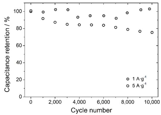 Clearly, high annealing temperatures drastically reduce the capacitance due to the removal of bound water and lower open porosity of the electrode []. A mild treatment at 70 °C improves the SC and provides a better cycling stability even at high current densities (Figure 7). The Coulombic efficiency for this sample remained above 98% even after 10 k cycles at 1 and 5 A g−1, and the capacitance retention was excellent at 1 A·g−1 and 75% at 5 A·g−1.