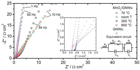 Nyquist plot of the samples: bare GNWs and MnO2/GNWs nanocomposite without annealing (room T) and annealed at 70 °C, 200 °C, and 600 °C. Inset shows real axis intercection and the modified Randles equivalent circuit used to fit the data of MnO2/GNWs.