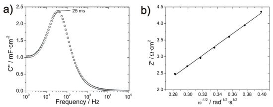 (a) C’’ vs. frequency plot to determine the relaxation time constant; (b) Z’ vs. ω1/2 plot to evaluate the diffusion coefficient of MnO2/GNWs heated at 70 °C.