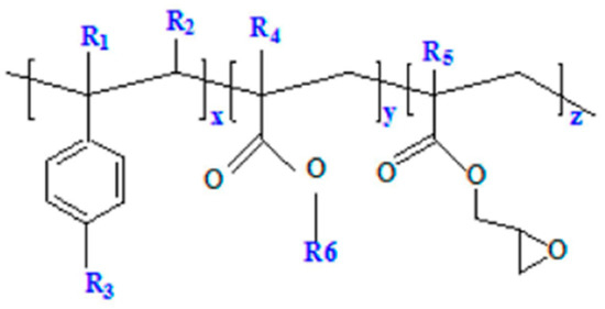 Figure 1. Chemical structure of Joncryl ADR®-4368, and the general structure of the styrene-acrylic multifunctional oligomeric chain extenders. R1–R5 are H, CH3, a higher alkyl group or combinations of them; R6 is an alkyl group. x, y and z are between 1 and 20.