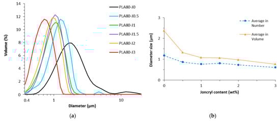 Figure 3. Size distribution curves (a) and emulsification curve (b) of PA11 dispersed phases diameter as a function of Joncryl content.
