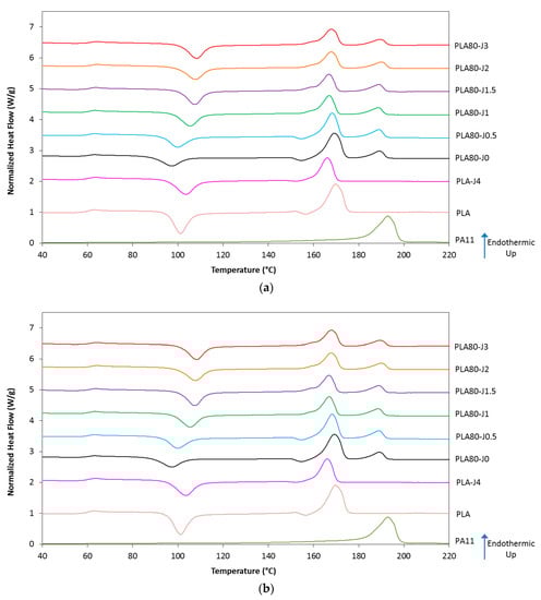 Figure 4. DSC thermograms of the second heating of neat polymers (a) and PLA80-Jx blends (b).