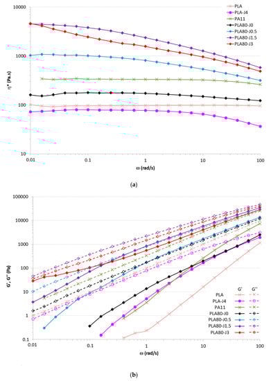 Figure 5 illustrates the evolution of the complex viscosity η*, the storage modulus G’ and the loss modulus G” versus angular frequency of PLA, PLA-J4, PA11 and PLA80-Jx blends (for x = 0; 0.5; 1.5; 3). First, we can note that PLA-J4 has a lower complex viscosity than PLA, but with a crossover point (between G’ and G’’) occurring at lower frequency than PLA. These results might be explained by the fact that some PLA chains have reacted with Joncryl, increasing the molecular weight or chain branching and then increasing the relaxation time of the chain [34]. Indeed, Wang et al. [35] have observed a slight crosslinking and an increase in molecular weight of PLA in the presence of Joncryl. However, in the other hand, there is probably free Joncryl that has not reacted with any PLA chains, because it was introduced in excess, and, as Joncryl is a small molecule (η0 = 30.6 Pa·s), it dramatically contributes to decrease the viscosity of the whole PLA-J4 sample.