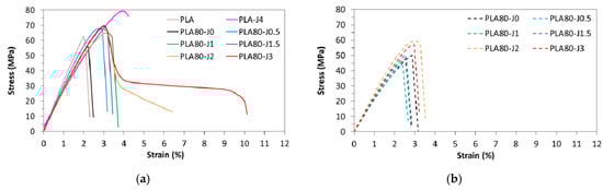 Figure 8. Stress–strain curves of injected PLA, PLA-J4 and PLA80-Jx blends (a) and FDM printed PLA80-Jx blends (b).