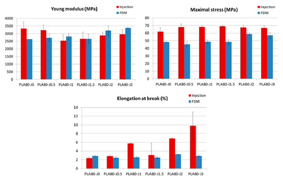 Figure 10. Injected versus FDM printed samples mechanical properties.