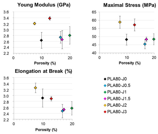 Figure 12. Mechanical properties as a function of porosity for FDM printed samples.