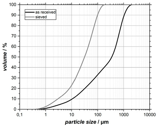 Cumulative particle size distributions of the as-received and the sieved EAC-1 material.