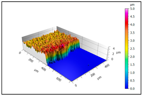 Figure 5 shows a pseudocolor image of a typical part of the masked edge area of sample 1. The smooth blue area on the right hand side represents the steel substrate whereas the yellow/red surface illustrates the deposited EAC-1 film. In the investigated section, the thickness of the film is constant with a thickness ~3 µm, but the visible small thickness differences suggest clearly a higher roughness than the substrate. The slight thickness increase at the edge of the film may be attributed to the used shadow mask that could lead to higher deposition rates near the mask edge.