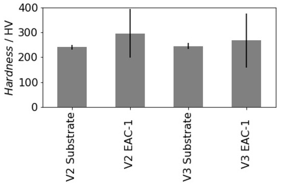 Average hardness values and corresponding standard deviations of substrates and deposited EAC-1 films.