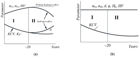 A generalized scheme of the gas main steel degradation: (a) In moderate climate conditions (Ukraine) [8]; (b) in conditions of the Far North (Yakutia, Russia) [12]; KCV—impact toughness; KIC—fracture toughness; σus—ultimate strength; σys—yield stress; HV—hardness; Hµ—microhardness; δ—relative elongation; φ—relative narrowing.
