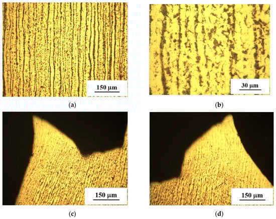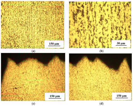 Microstructure of the fragment under investigation taken from the “Novopskov-Aksai-Mozdok” gas pipeline (Nevinnomysskaya CS): ferrite-pearlite structure with a striped morphology—(a) (×100); (b) (×400); microstructure in the neck region of tensile stretched specimens (×100) (c,d).