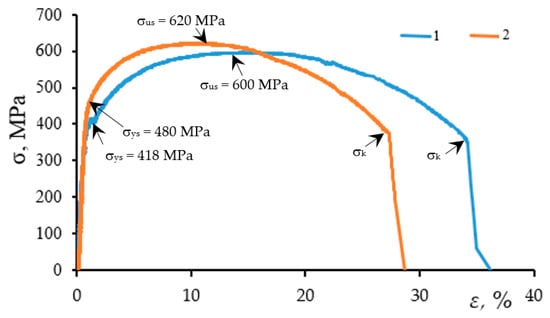 To evaluate the strength properties of the steels under study, the static stress–strain diagrams for the specimens were constructed, see Figure 4. Below, the main differences between the shape and parameters of the obtained diagrams are described.