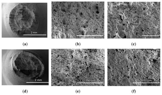 SEM micrographs of the fracture surface of the failed specimens taken from gas pipelines: (a–c) “Novopskov-Aksai-Mozdok” (Nevinnomysskaya CS); (d–f) “Gorky-Center” (Gavrilovskaya CS).