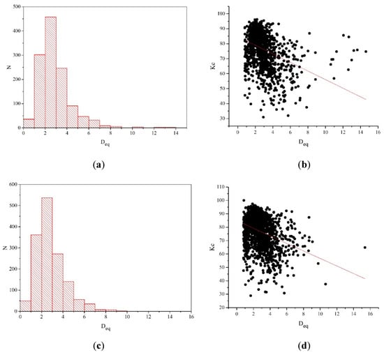 Distribution histograms on the diameters and shape coefficients of the dimples found on the steel fracture surface of the gas pipelines: (a,b) “Novopskov-Aksai-Mozdok” (Nevinnomysskaya CS); (c,d) “Gorky-Center” (Gavrilovskaya CS).