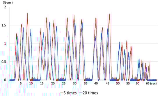 Representative diagrams of torque generations according to the number of repetitive insertions of glide-path instrument at the working length (red plot: group 5, blue plot: group 20). Total torque generations between group 5 (red plot) and group 20 (blue plot) were significantly different (p < 0.05; Table 1).