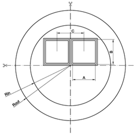 The disposal canister is basically a carbon steel cylinder, is almost 5 metres long and is designed to fit 4 PWR FAs in 4 separate inserted and welded carbon steel boxes (see Figure 1). The preliminary dimensions selected for the present analysis were Rin = 41 cm, Rout = 55 cm, box centre-centre (C-C) separation = 17.9 cm, A ≈ 21.5 cm (side of the FA top head) and B ≈ 23.5 cm (inner side of the FA box). The analysis performed refers entirely to this disposal canister concept.